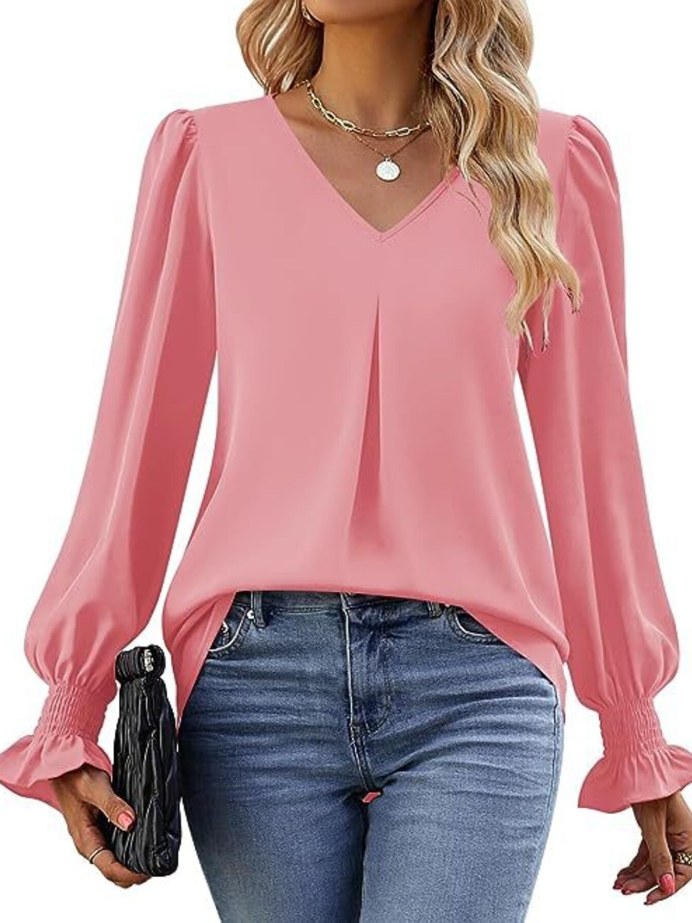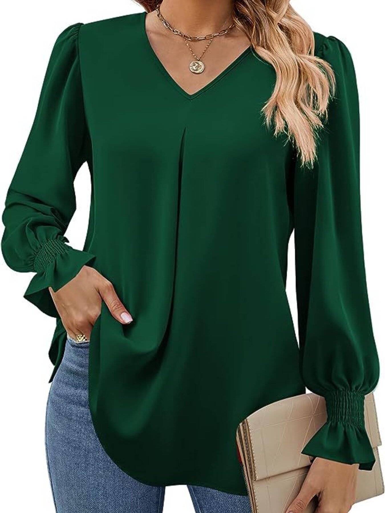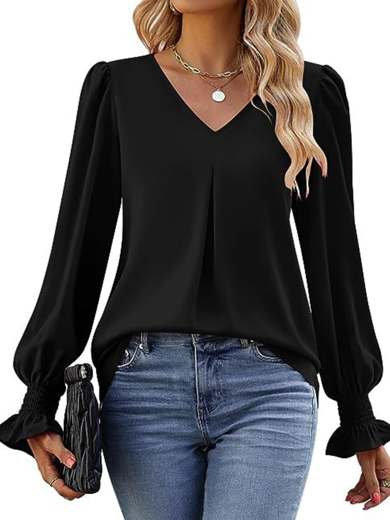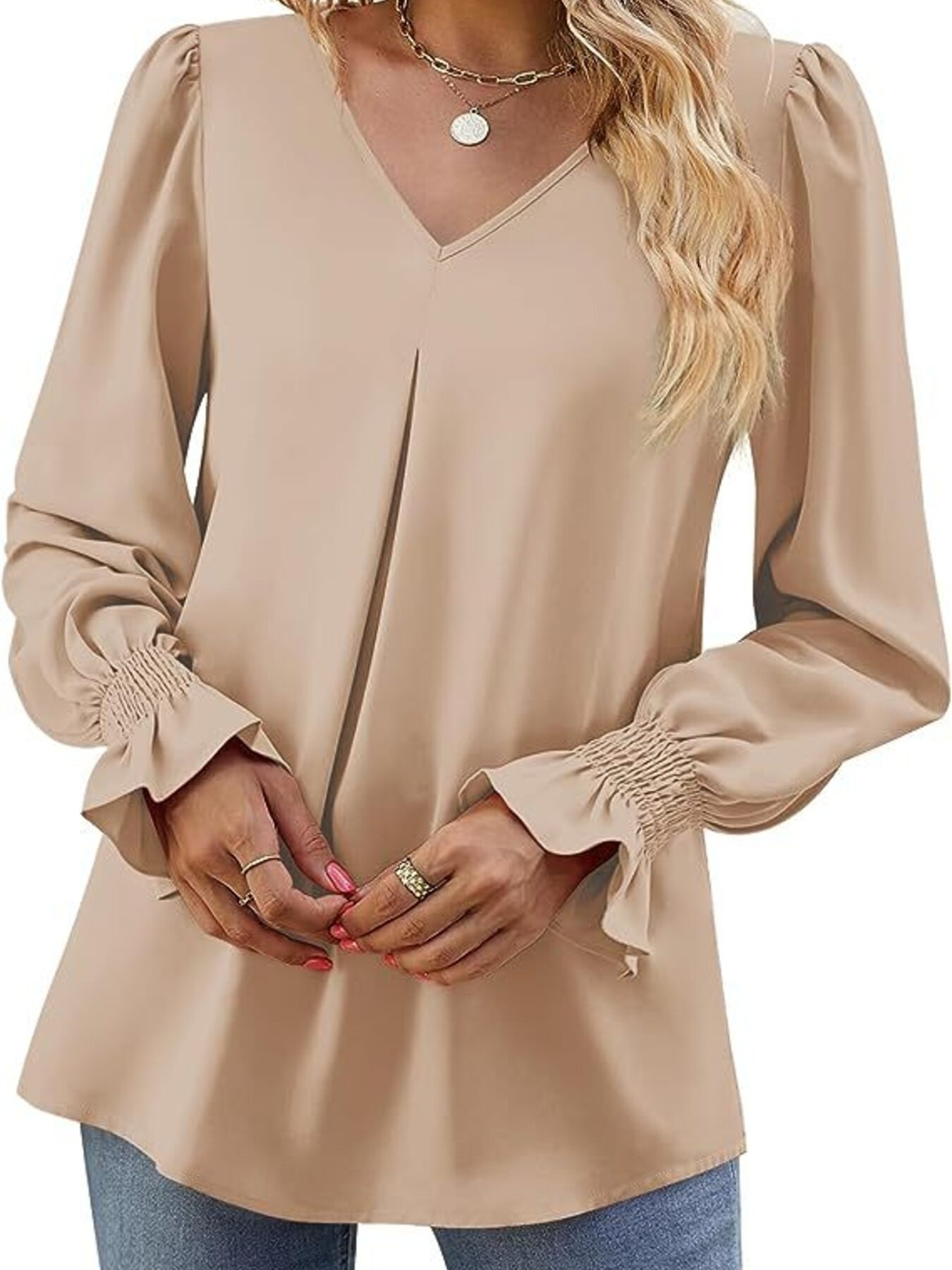 V-Neck Long Sleeve Ruffle Cuff Blouse