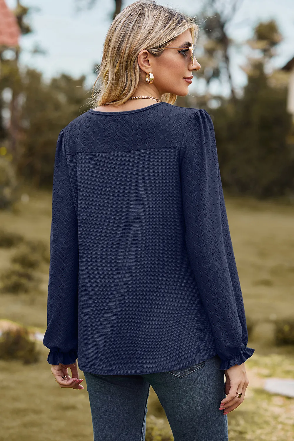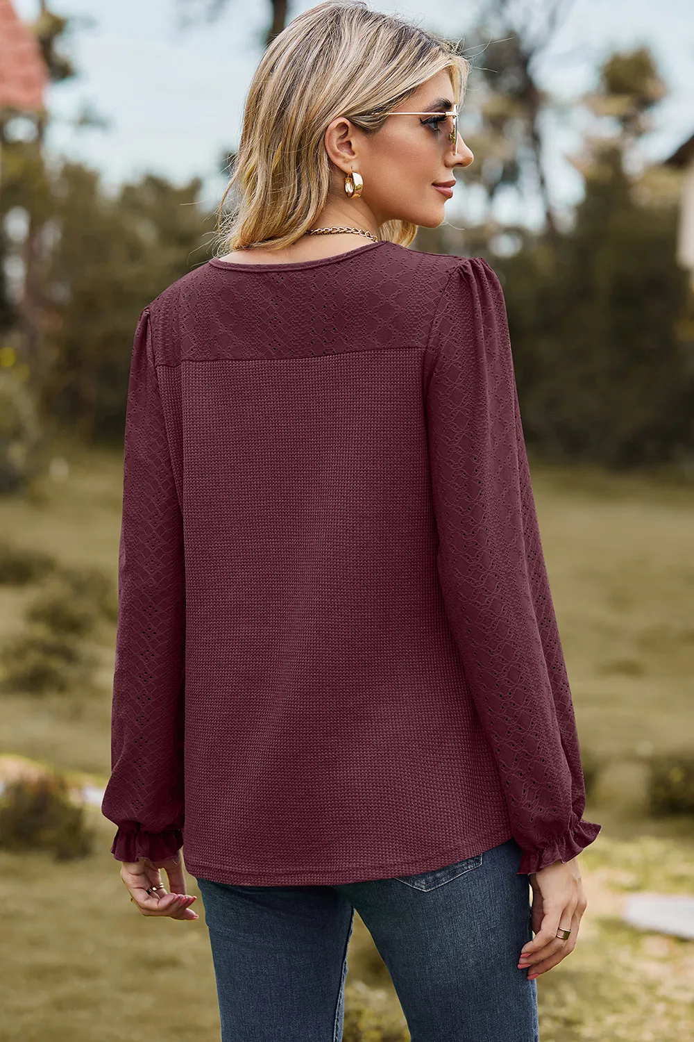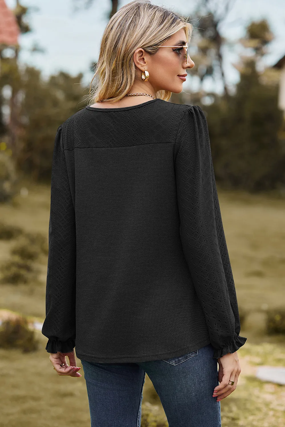 Eyelet Round Neck Flounce Sleeve T-Shirt