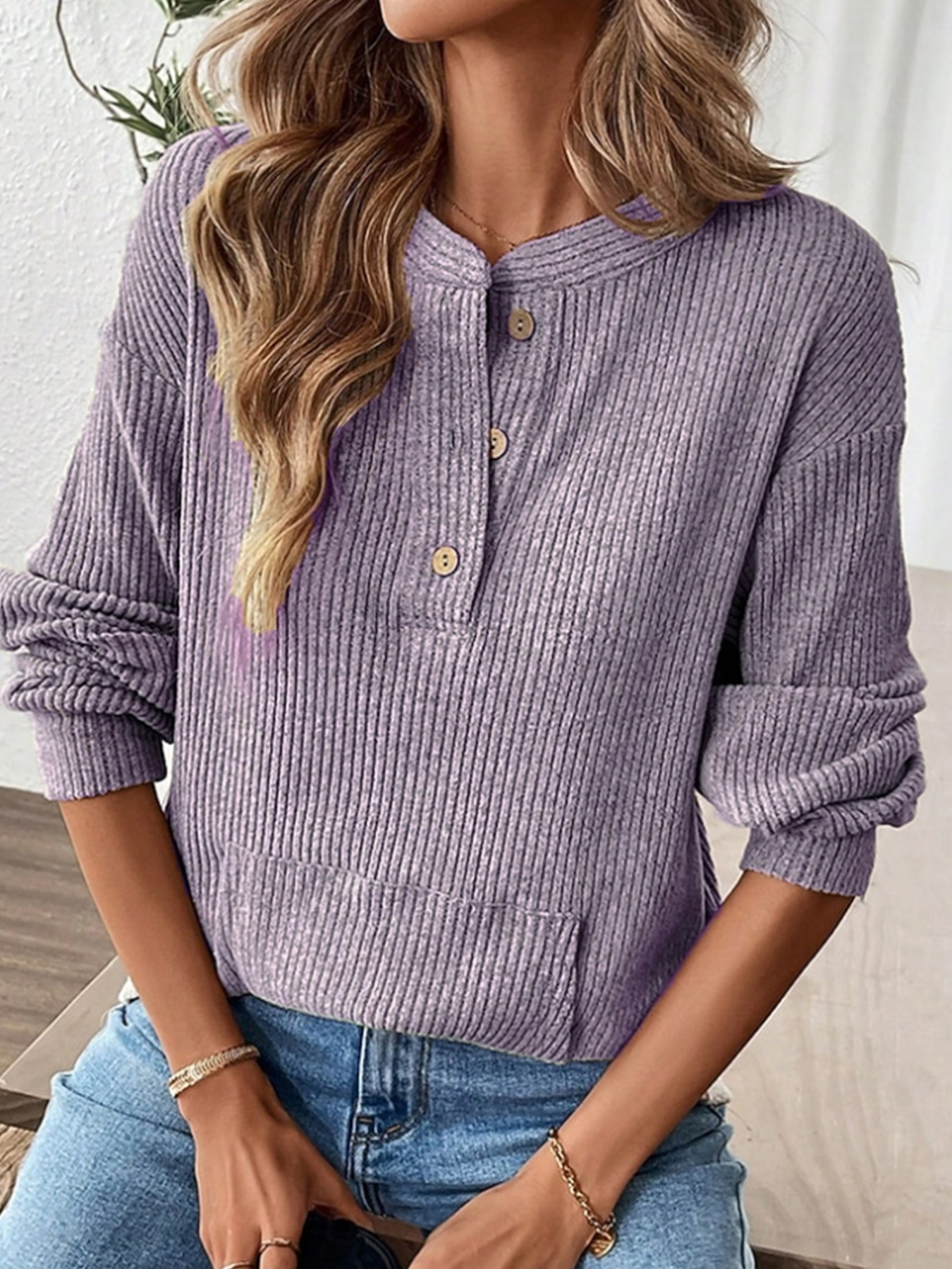 Ribbed Button Detail Long Sleeve T-Shirt