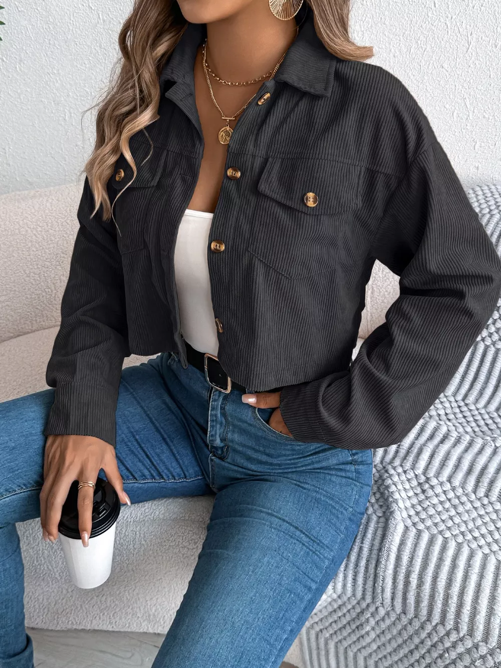 Corduroy Button-Up Dropped Shoulder Jacket