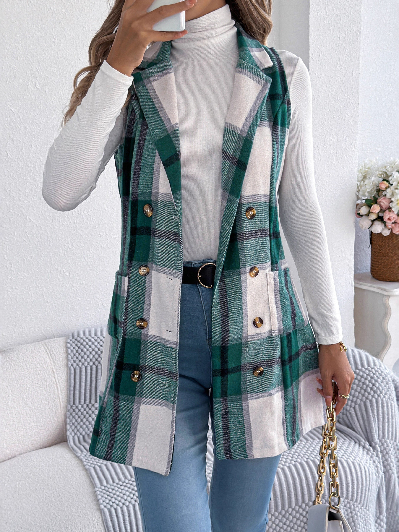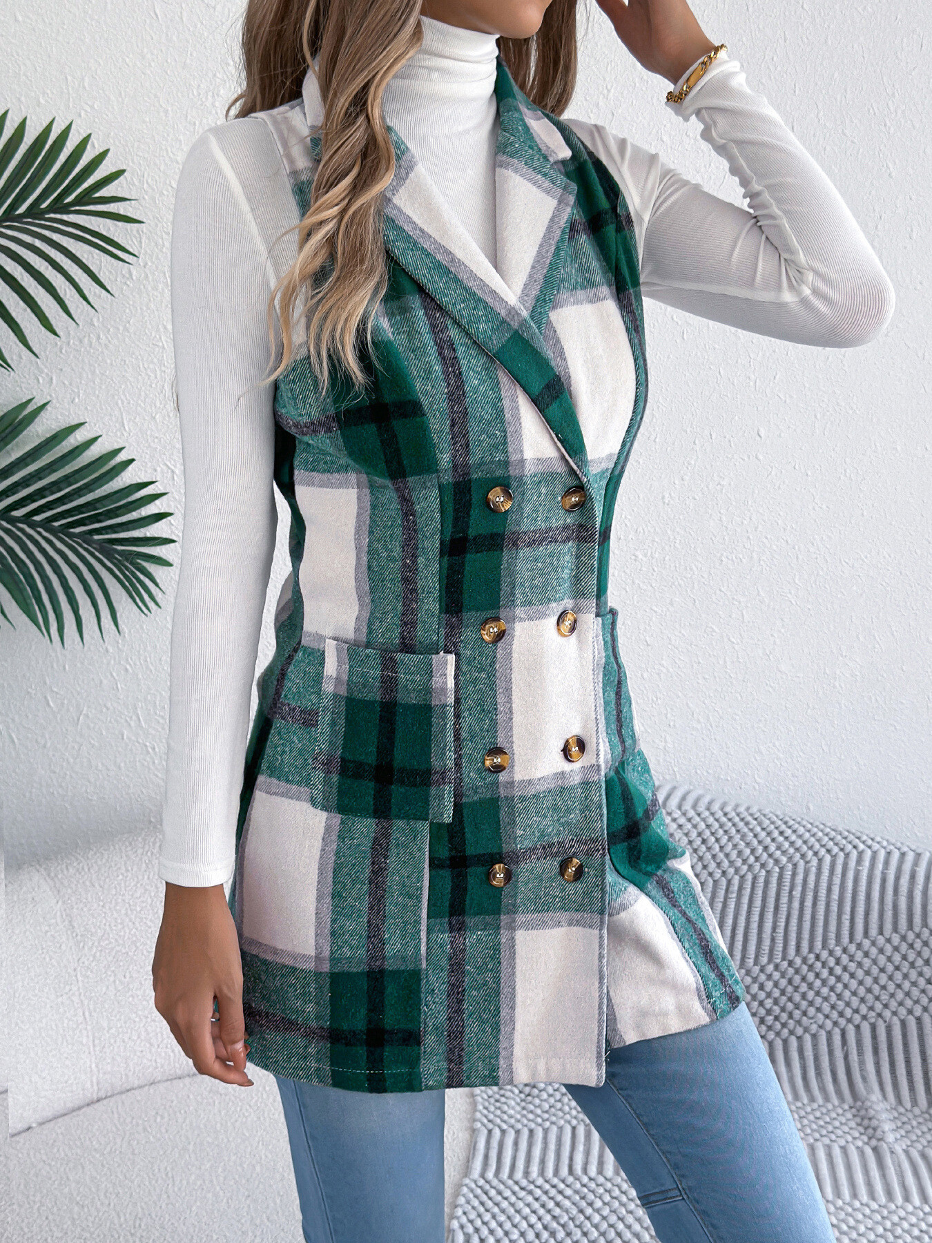 Plaid Double-Breasted Vest Coat