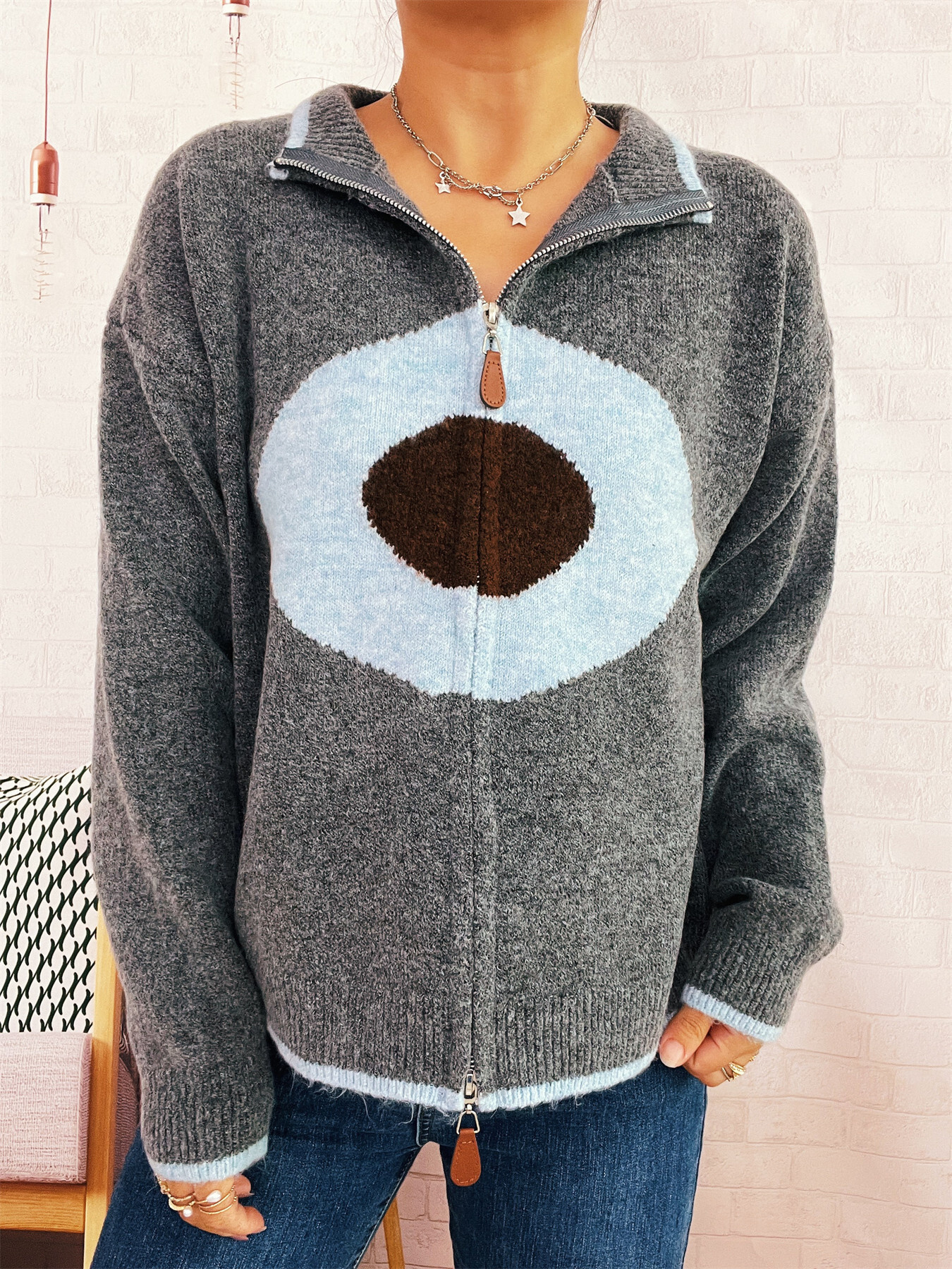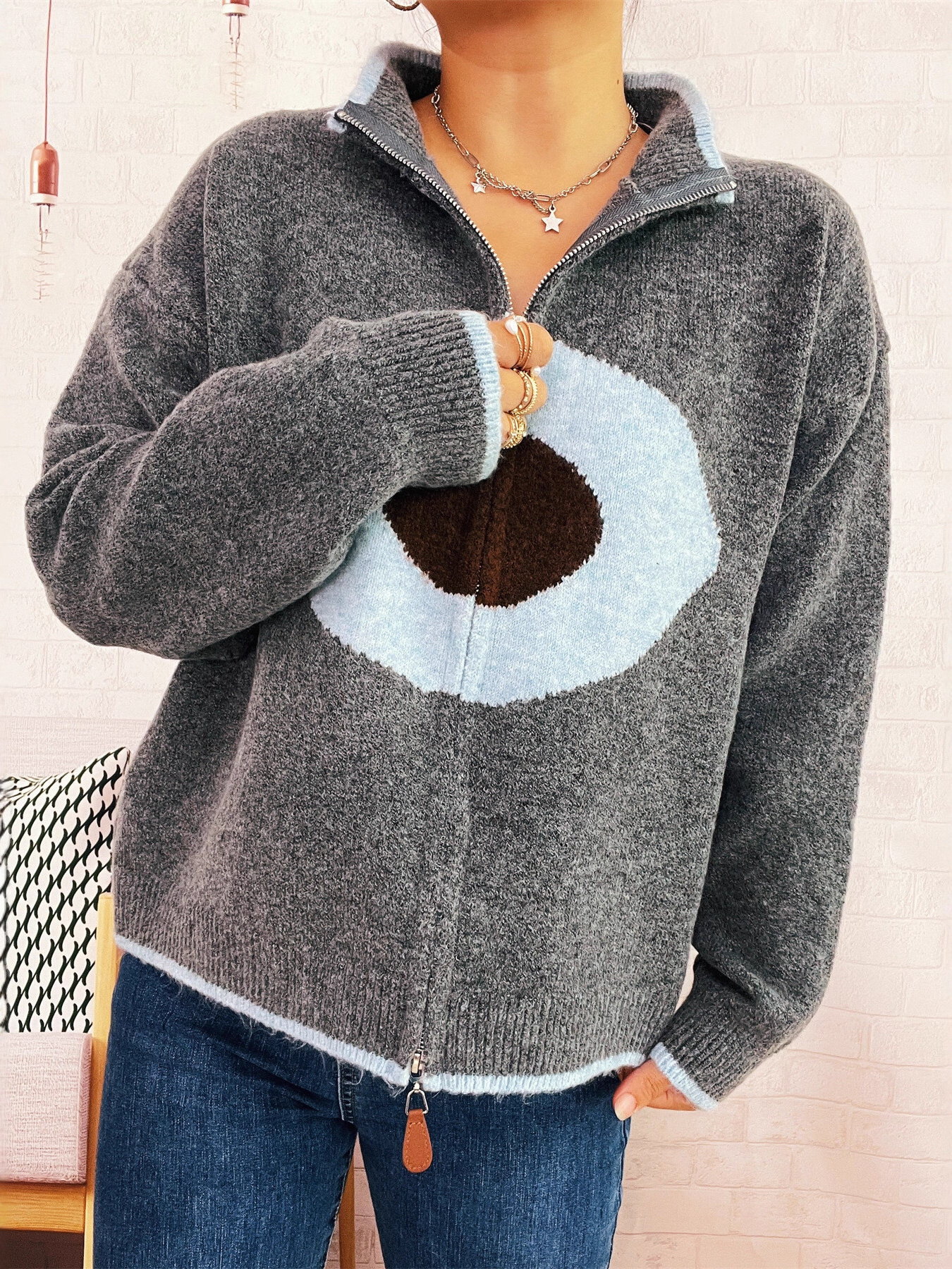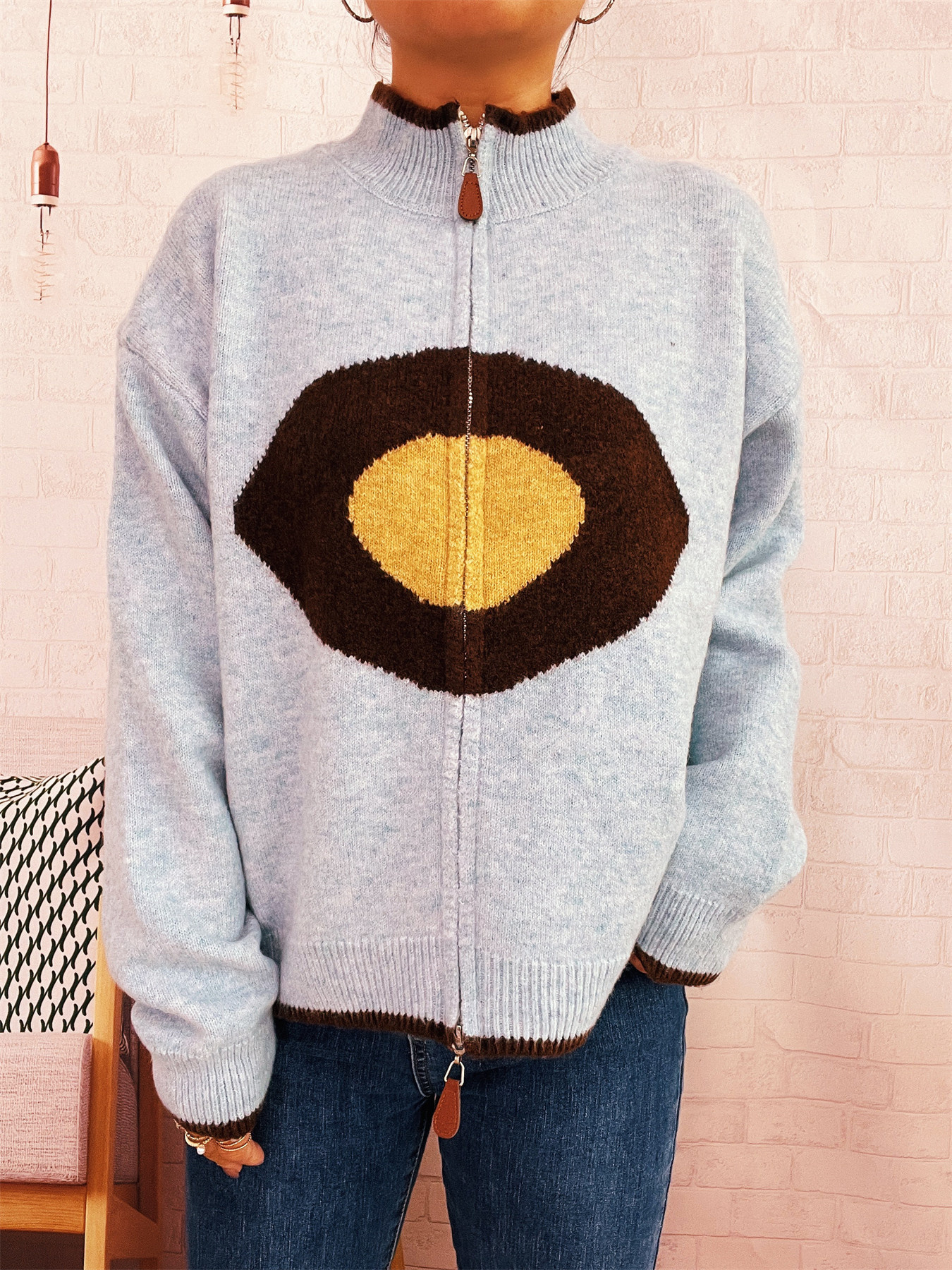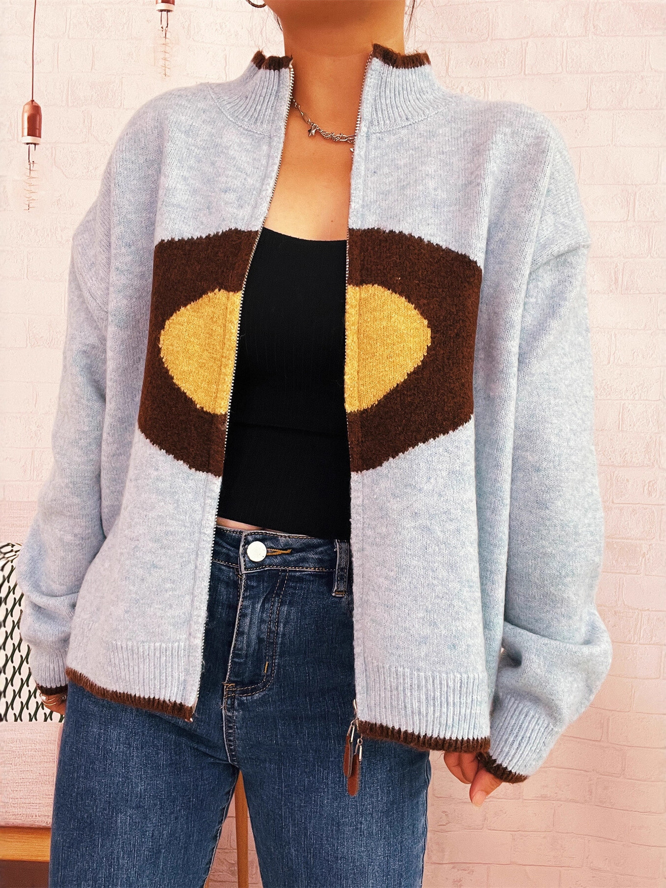 Zip-Up Contrast Trim Cardigan