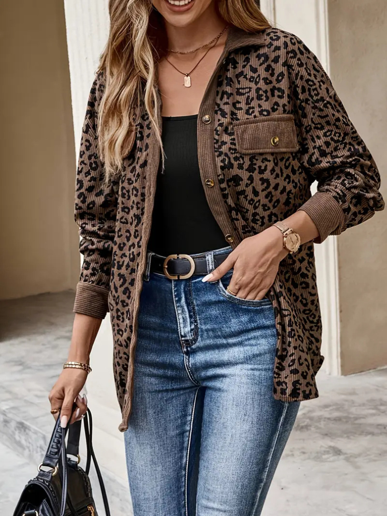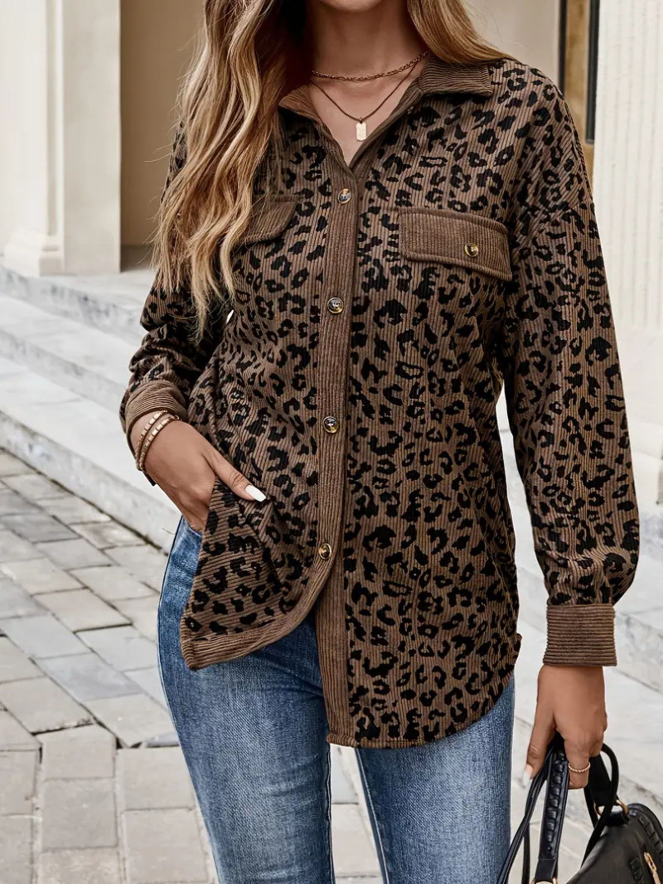 Leopard Print Corduroy Button-Up Jacket