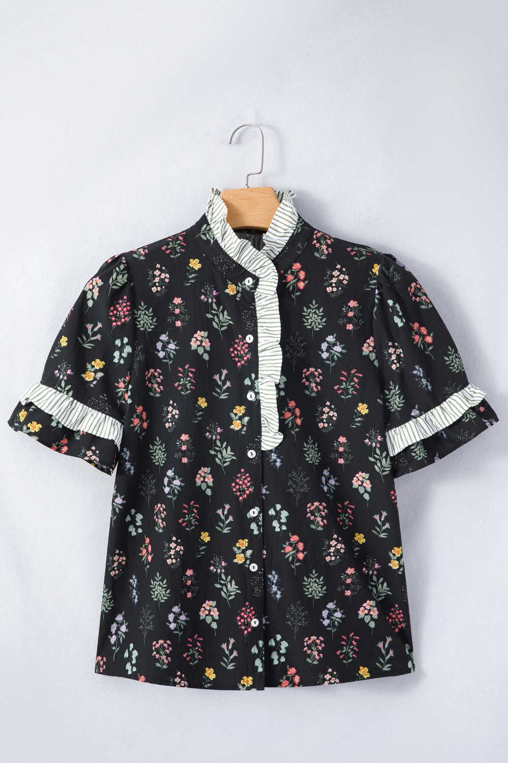 Contrast Frilled Trim Short Sleeve Floral Shirt