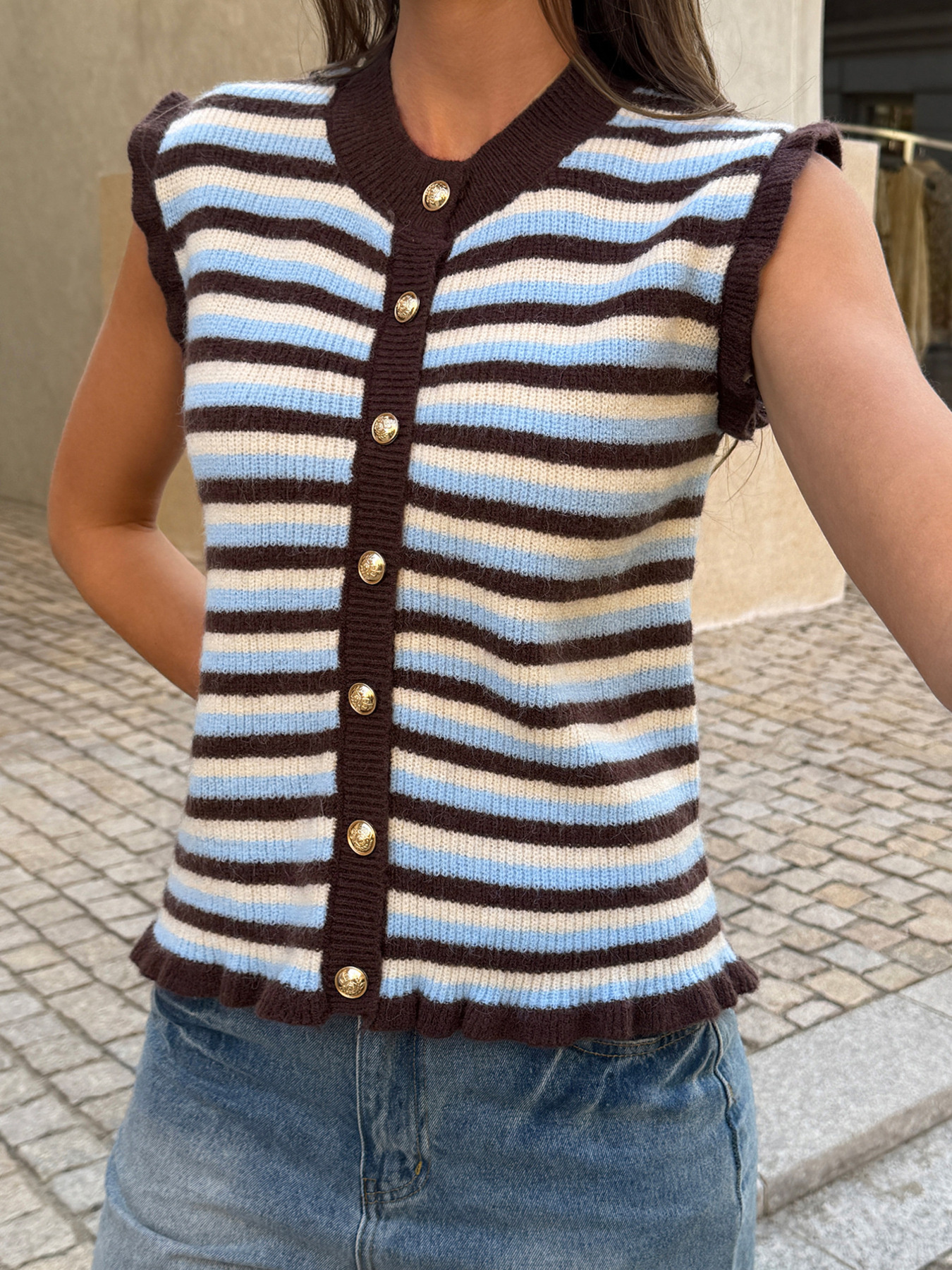 Striped Button-Down Sleeveless Knit Cardigan