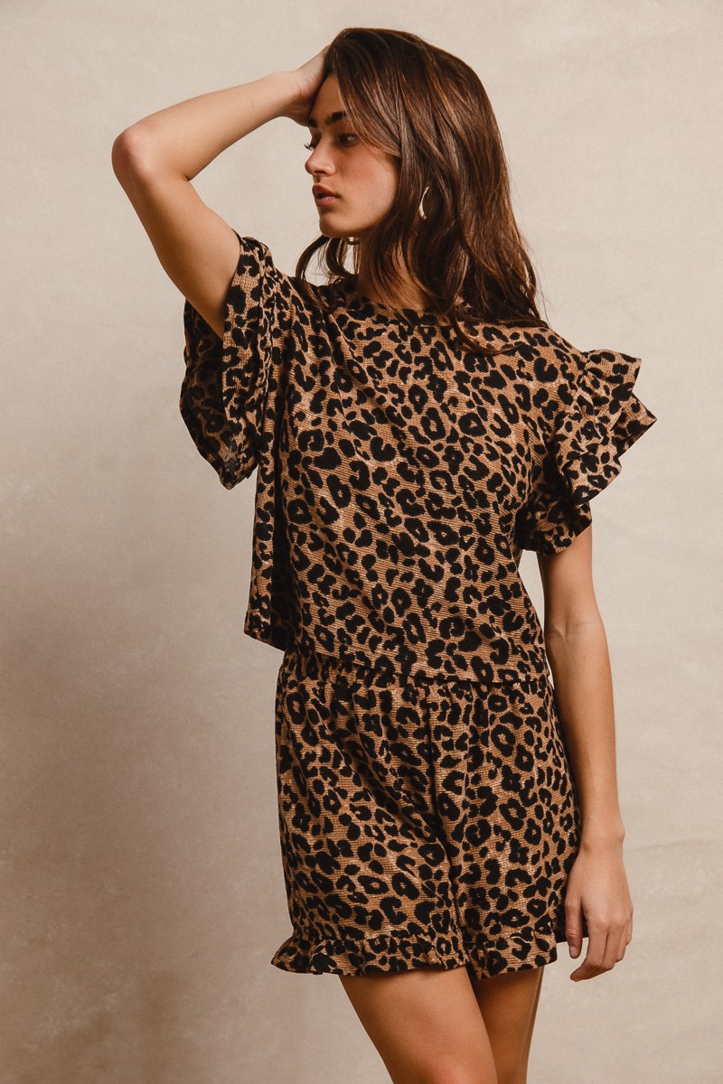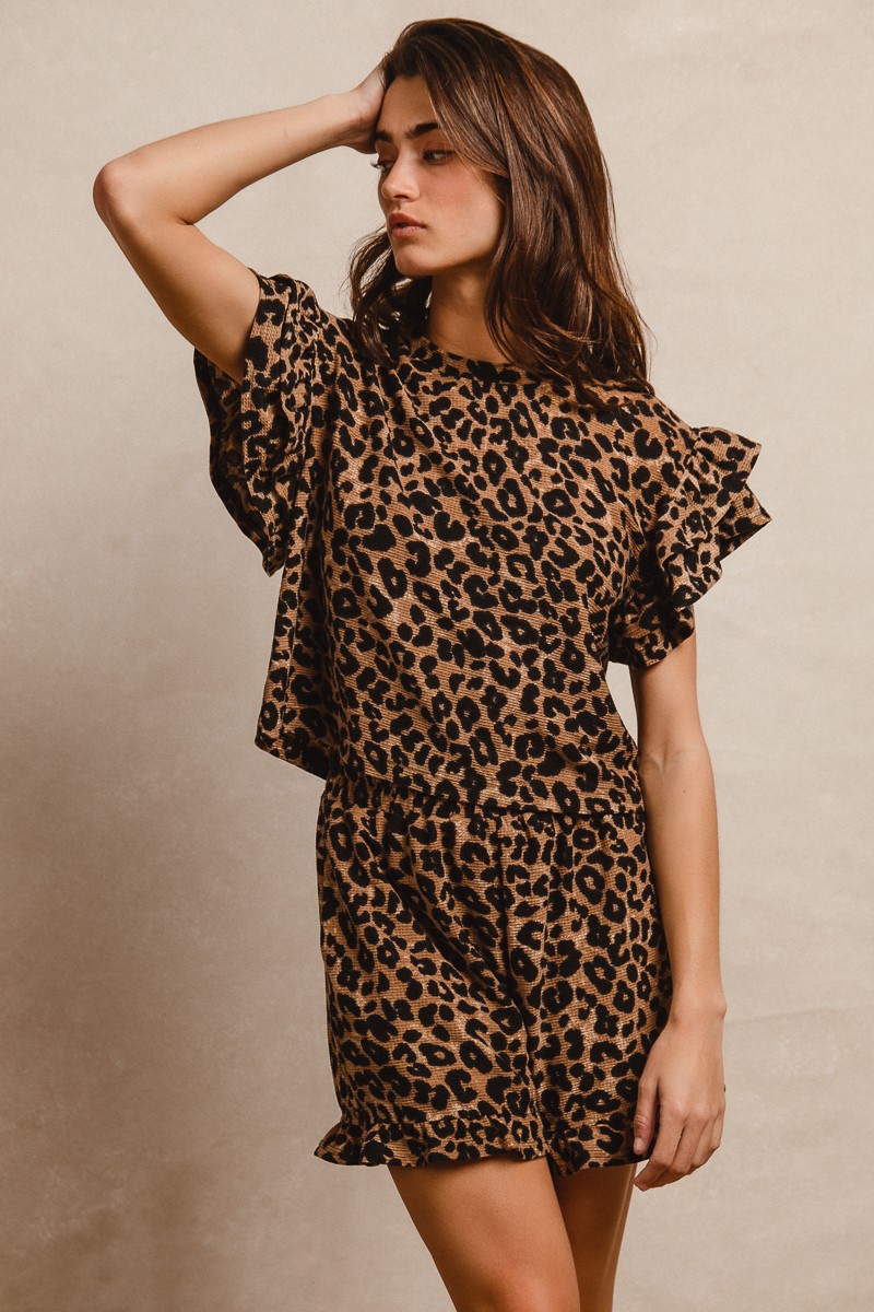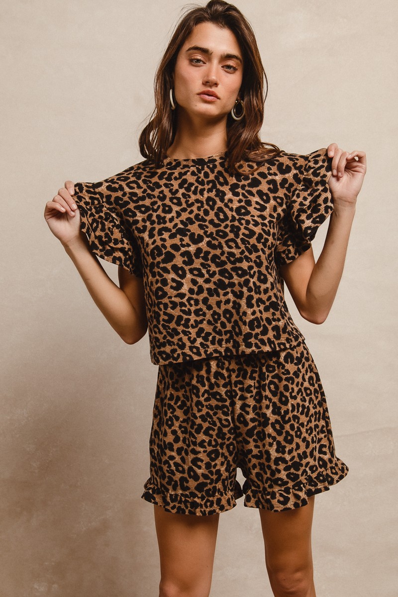 Bibi Leopard Print Waffle Texture Layered Ruffle Sleeve Top And Shorts Set
