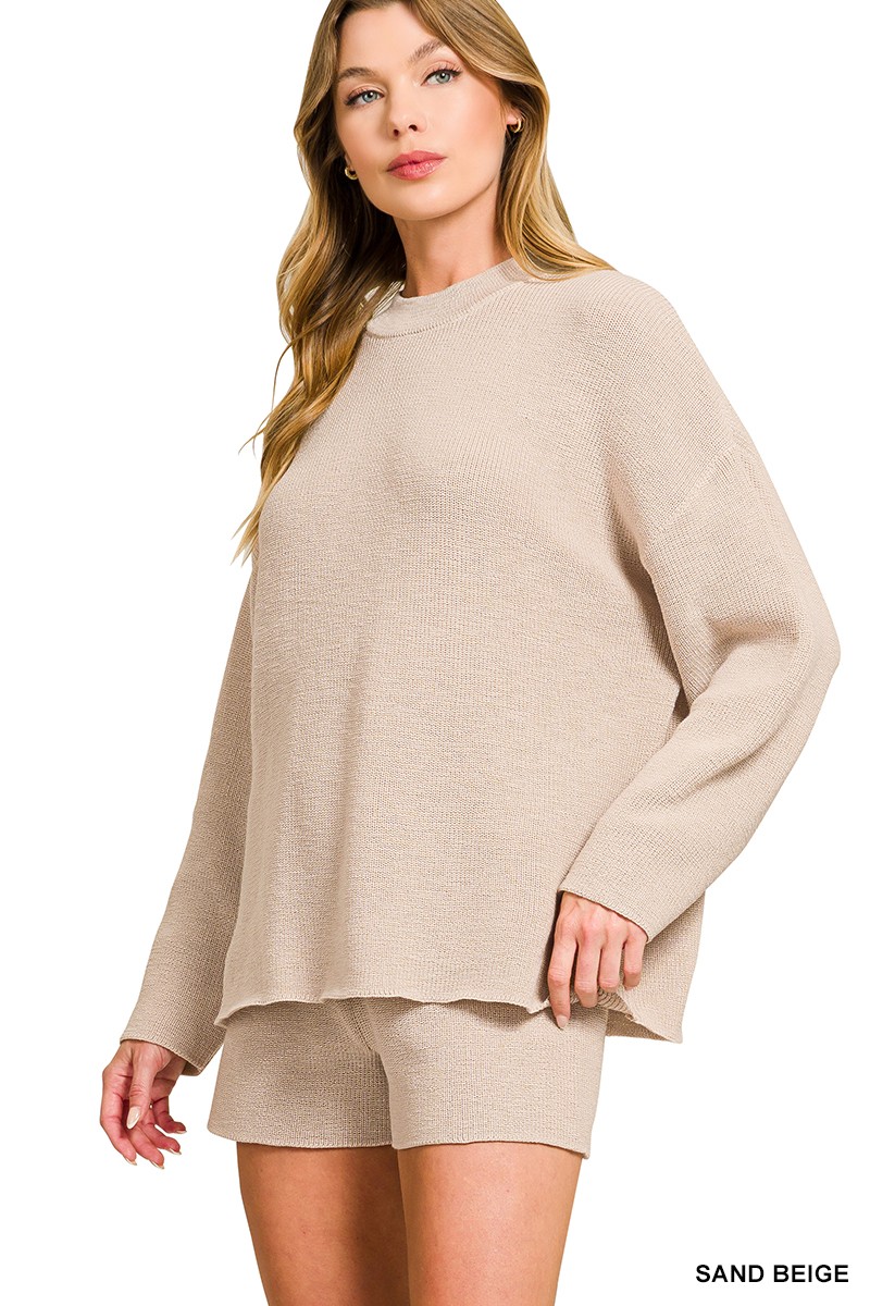 Zenana Round Neck Knit Top And Shorts Sweater Set