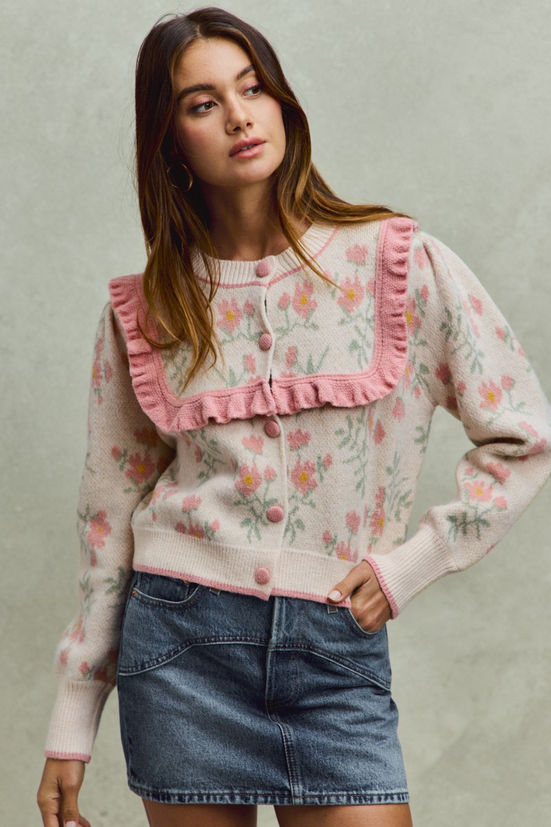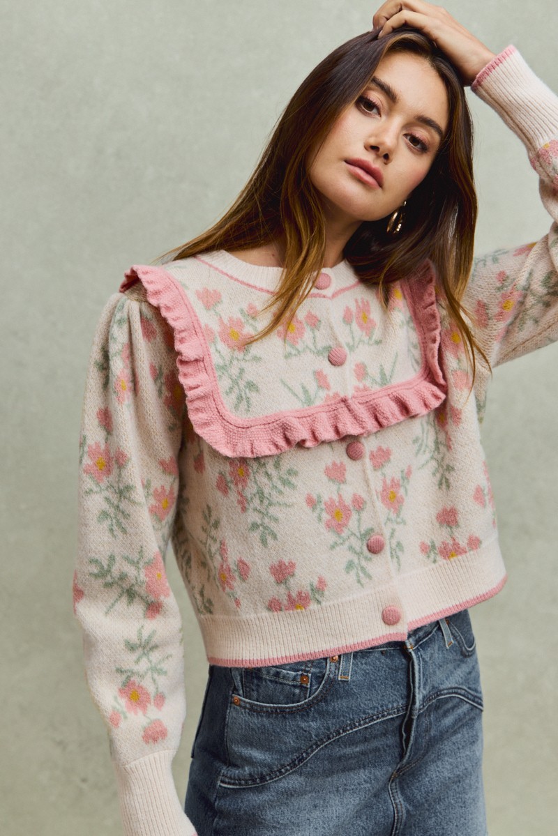 So Me Flower With Ruffle Detailing Sweater Cardigan