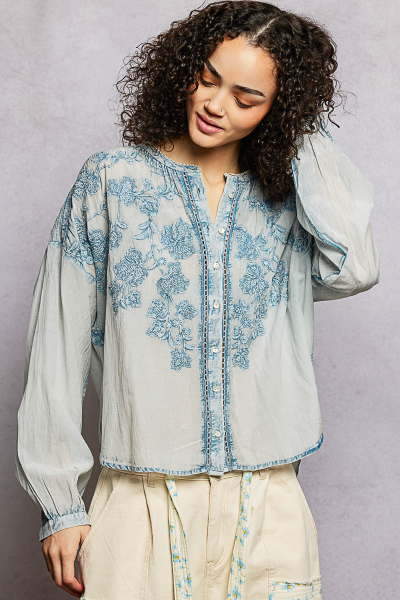 Pol Floral Embroidered Button Down Long Sleeve Shirt