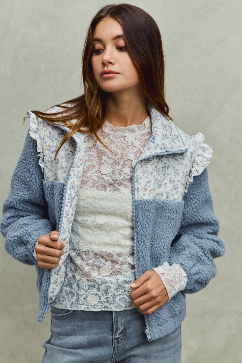So Me Faux Fur Sherpa Pull Jacket With Floral Contrast