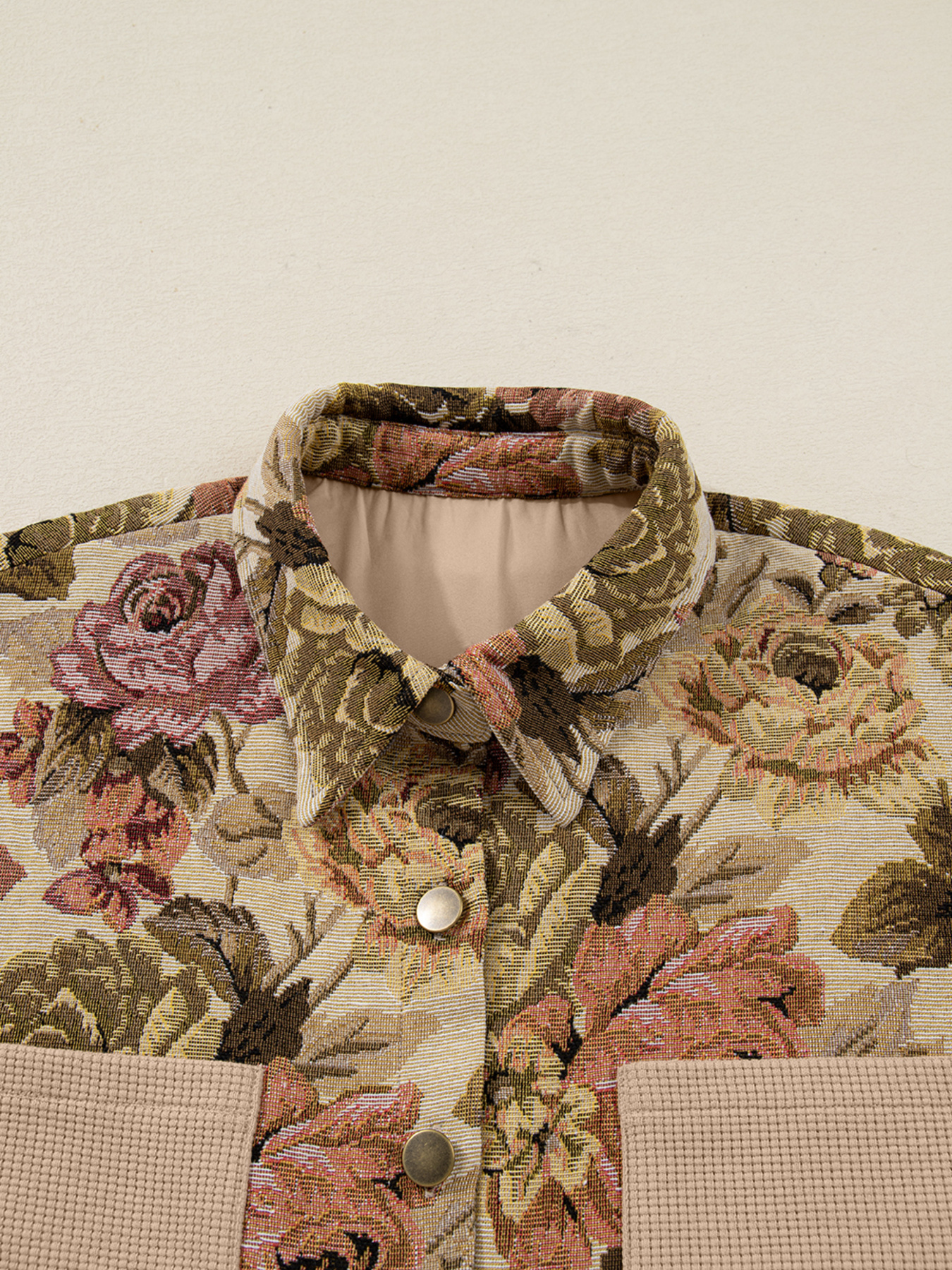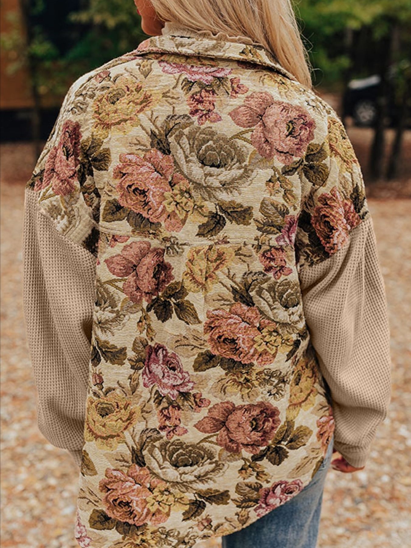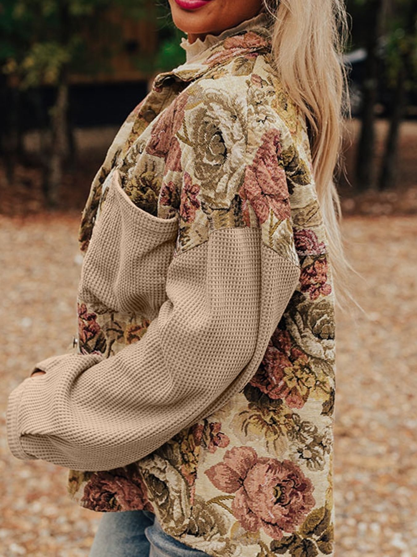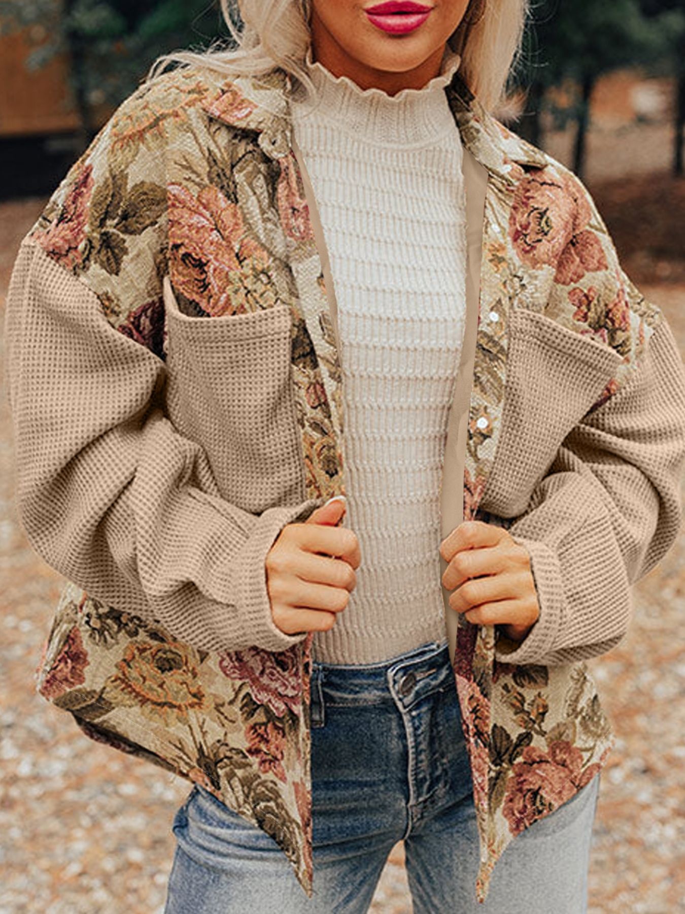 Floral Waffle Knit Patchwork Chest Pockets Buttoned Jacket