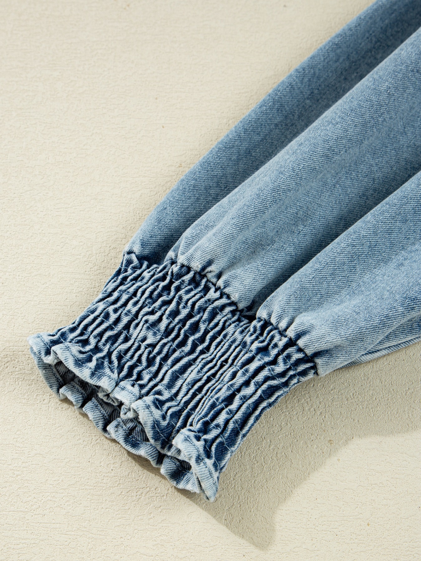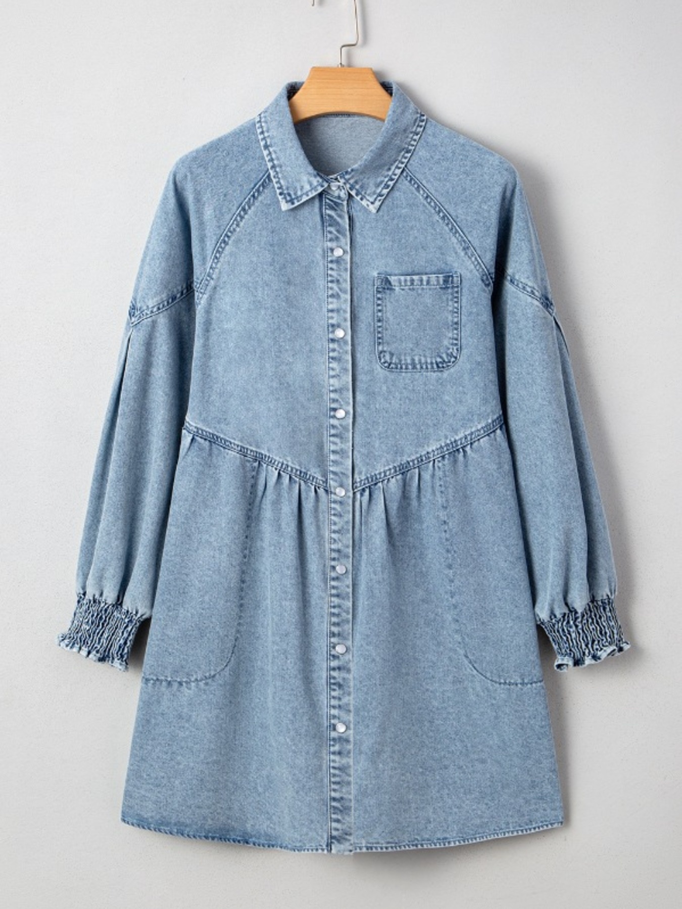 Button-Up Denim Shirt Dress With Smocked Cuffs